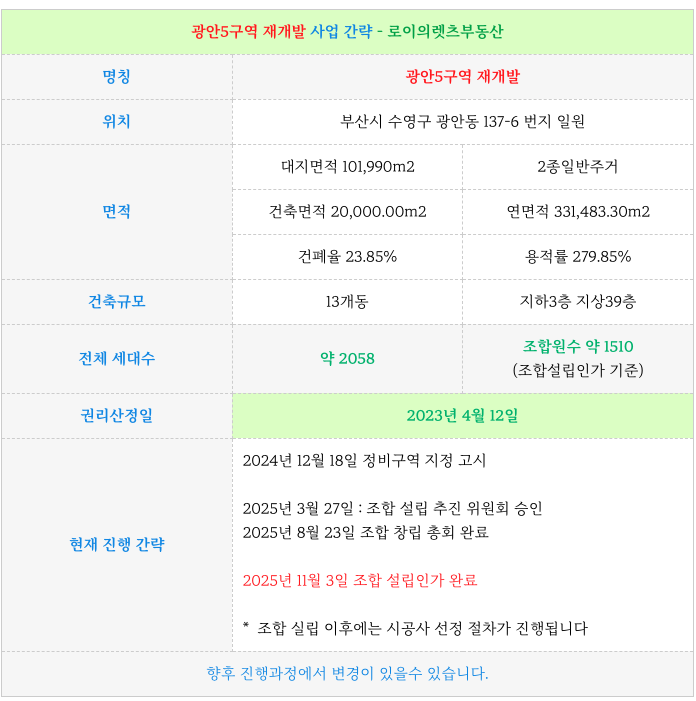 | 광안5구역 재개발 : 조합설립인가 소식 & 소액 매물 (0) | 2025.11.27 |