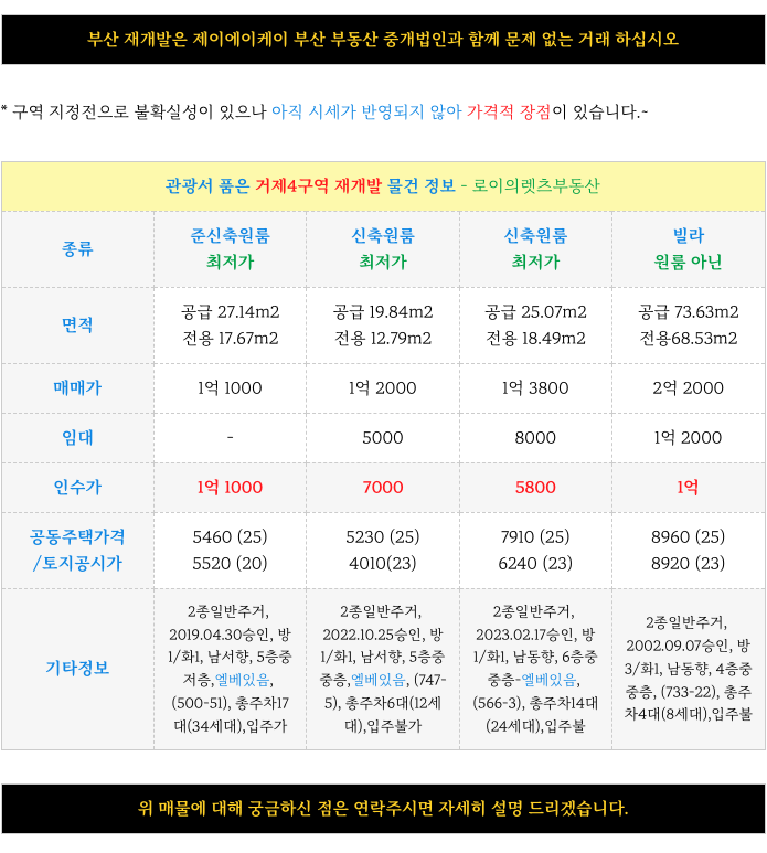 1. 거제4구역 재개발 : 신축 소액 매물등 추/천 매물 :