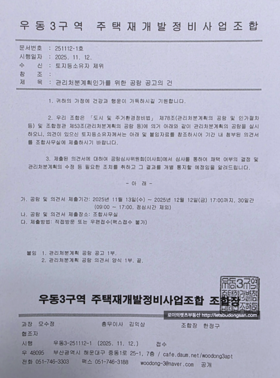 2025년 11월 13일 ~ 12월 12일 : 관리처분계획인가를 위한 공람 공고