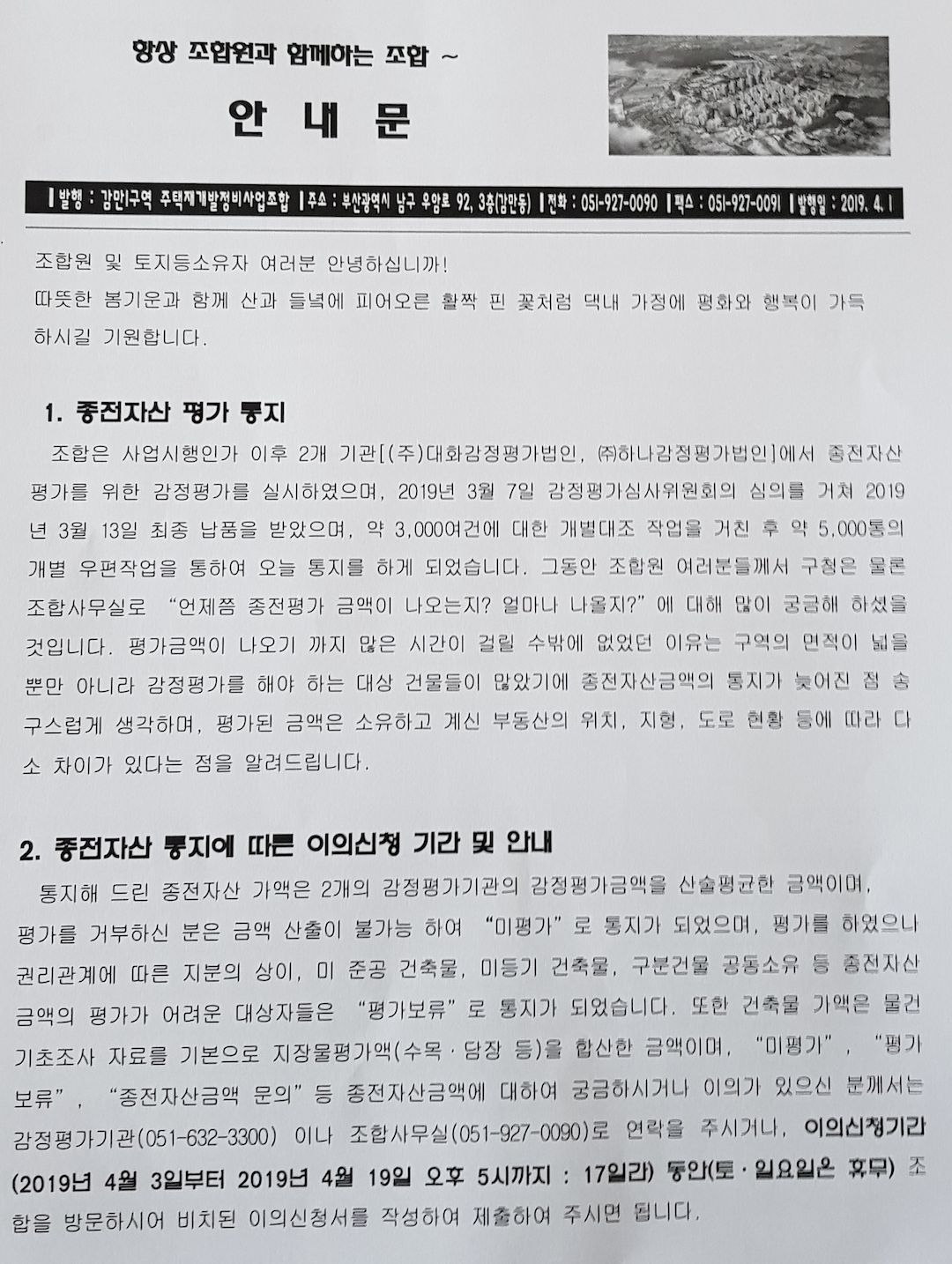 - 4월 3일 ~15일까지 이의 신청 기간 입니다. ( 조합 사무실에서 작성 제출 )