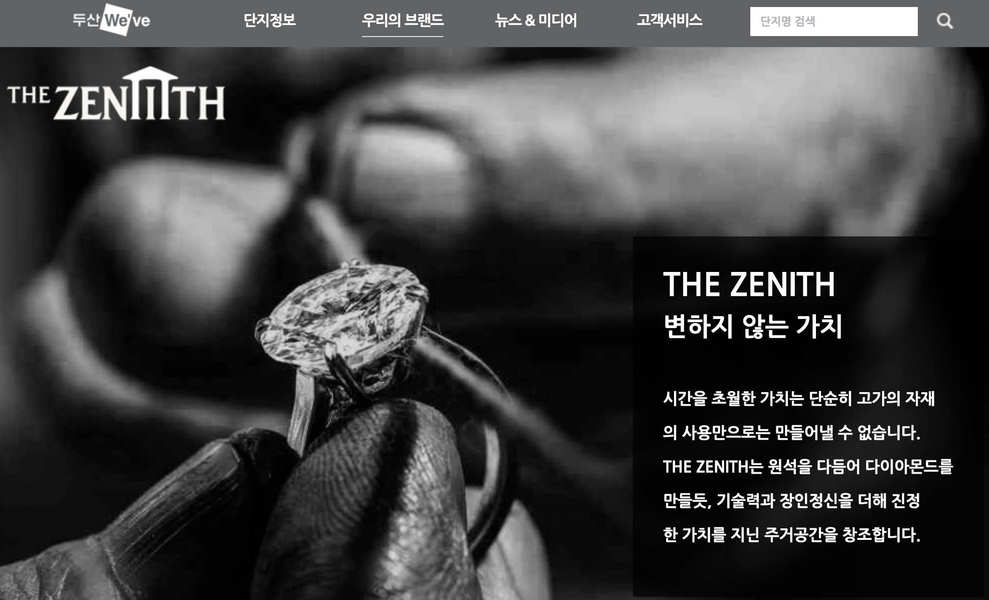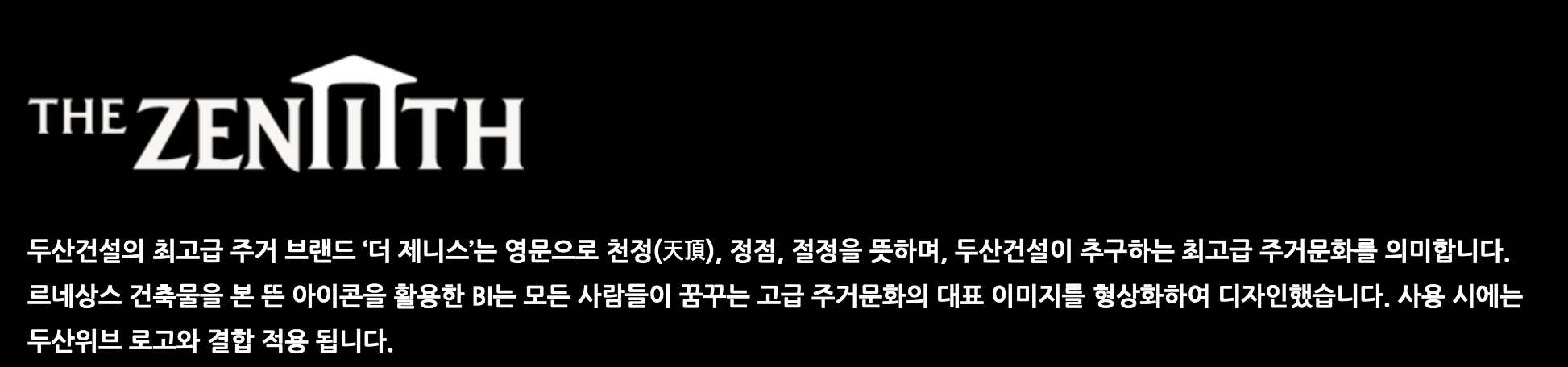 두산건설의 최고급 주거 브랜드 ‘더 제니스’ 는 영문으로 정점, 절정을 뜻하며,