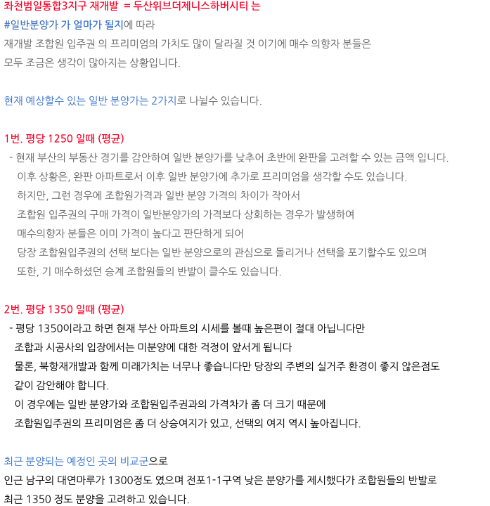 좌천범일통합3지구, 두산위브더제니스하버시티 문의정리 : 일반분양가 조합원매물