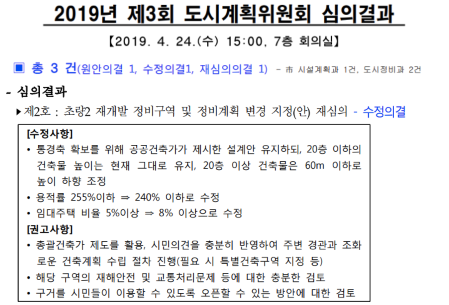 * 초량2구역의 도시 계획위원회 심의가 아래 3가지 사항으로 수정 의결이 되었습니다.