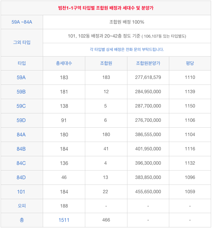 범천1-1구역 재개발 평형별 세대별 조합원 분양가 입니다.
