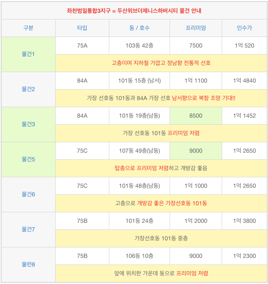 그외 조합원 입주권 물건은 아래 표를 참조하여 주십시오