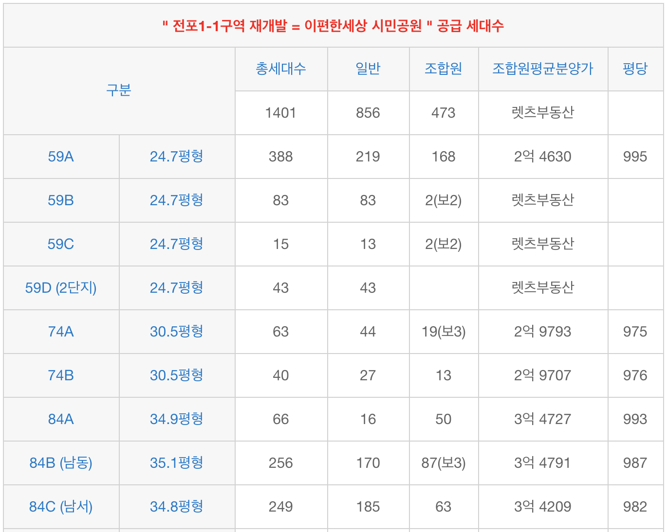 전포1-1구역 재개발 = 이편한세상 시민공원 타입별 물건 |
