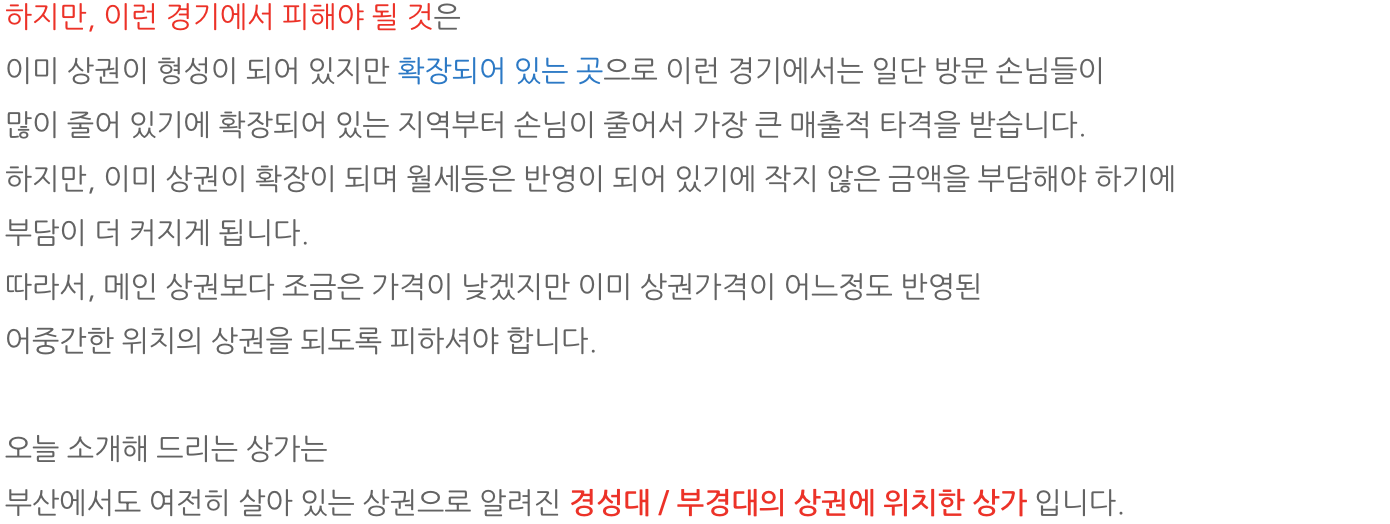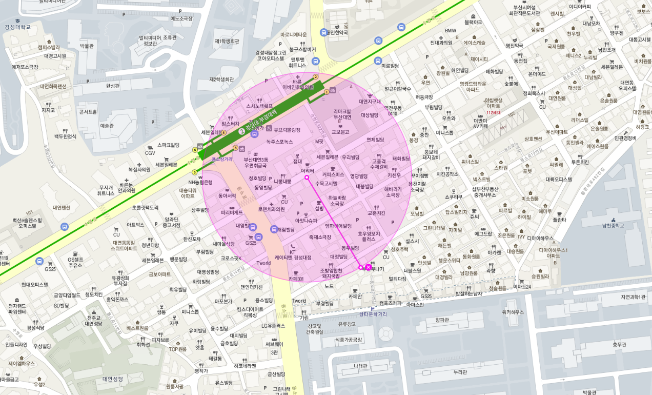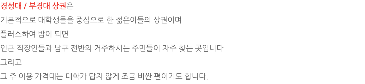 - 모두 위 지도와 같이 경성대 상권의 메인 자리에 위치해 있습니다.