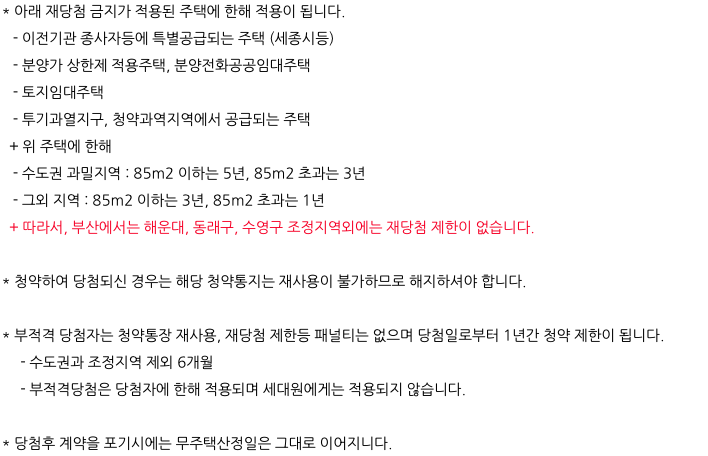 - 당첨자 발표일이 같은 아파트에는 중복 청약이 불가 합니다.