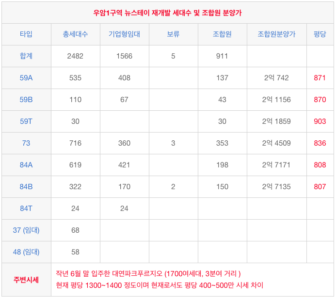 우암1구역의 각 타입별 세대수를 체크해 보겠습니다.