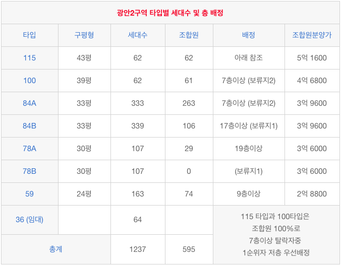 광안2구역 재개발 의 평형 타입별 세대수 조합원 분양가 등을 보시겠습니다.
