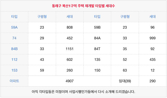 복산1구역 재개발 의 타입별 세대수를 보면 추가적인 특징을 볼수 있습니다.