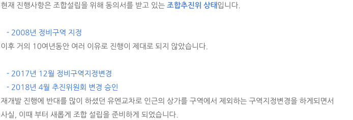 현재 진행사항은 조합설립을 위해 동의서를 받고 있는 조합추진위 상태입니다.