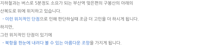 위에서 언급 드린 것처럼 부산역과 새롭게 변모될 북항재개발 일대, 그리고 부산항대교가 한눈에