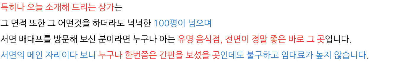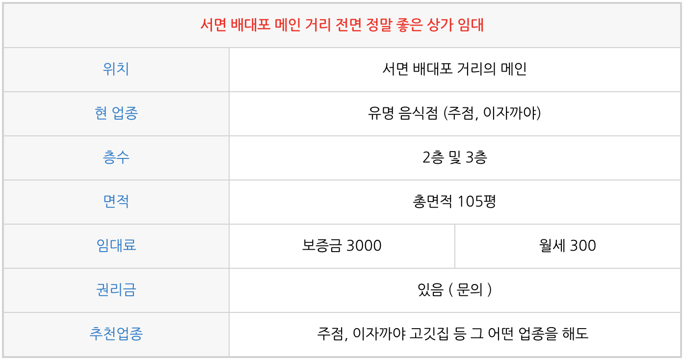 위 물건 서면 배대포 메인 상가 임대에 관심이 있으신 분들은 언제나 편하게 문의해 주십시오.