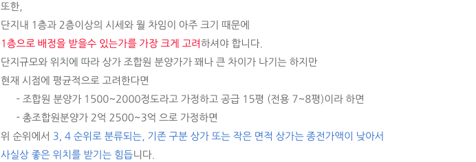 1층으로 배정을 받기 위해서는 아무래도 감정가가 조금 커야 하기에 실 투자금액 역시 높습니다.