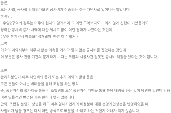 조합측에서는 조합원을 위한 가장 좋은 방안을 시공사와 잘 협의하여 안건을 제시할 수 있기를 바랍니다.