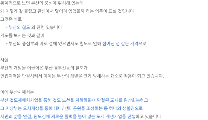 부산의 미래를 만드는 재개조 사업으로 북항재개발사업과 맞물려 함께 진행되는 사업입니다.