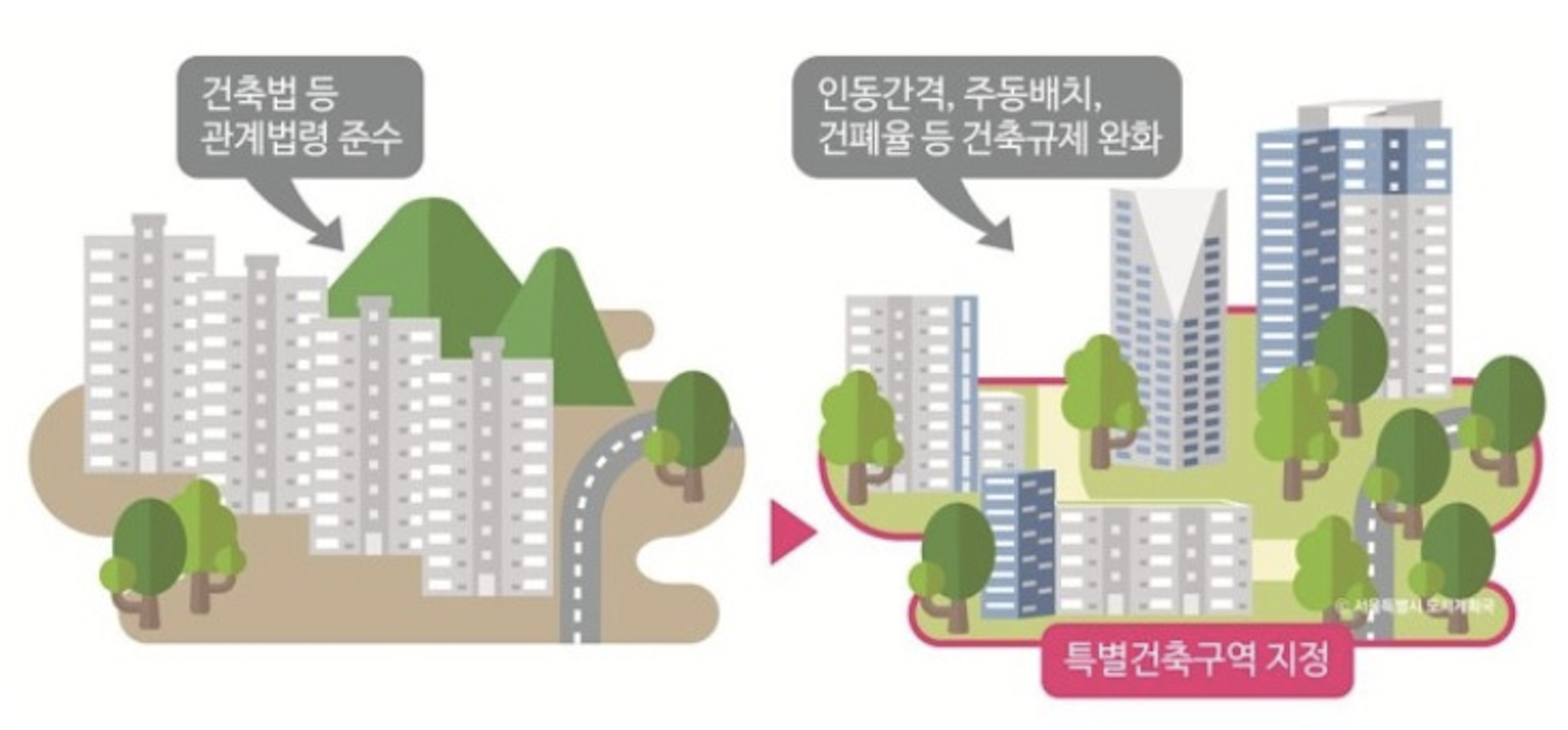 2008년 특별건축구역 지정 근거가 마련되었고 2010년 처음 지정이후 서울, 경기지역으로 지정 개발이 되고 있는 추세입니다. 주요사례는 신반포1차, 신반포3차, 반포주공1단지, 개포주공9단지, 은마아파트(신청), 서울은평뉴타운, 한남뉴타운, 세종시일부 등이 있습니다. 부산에서는 북항재개발이 특별 건축 구역입니다. |