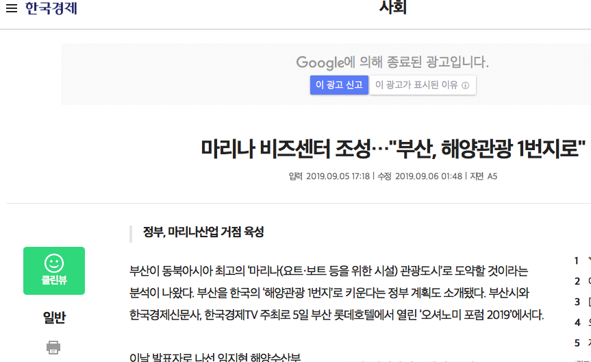 어제 9월 5일 롯데호텔에서 열린 " 오셔노비 포럼 2019 " 에서 해양수산부의 임지현 해양레저관광과장이 발표자로 나서서