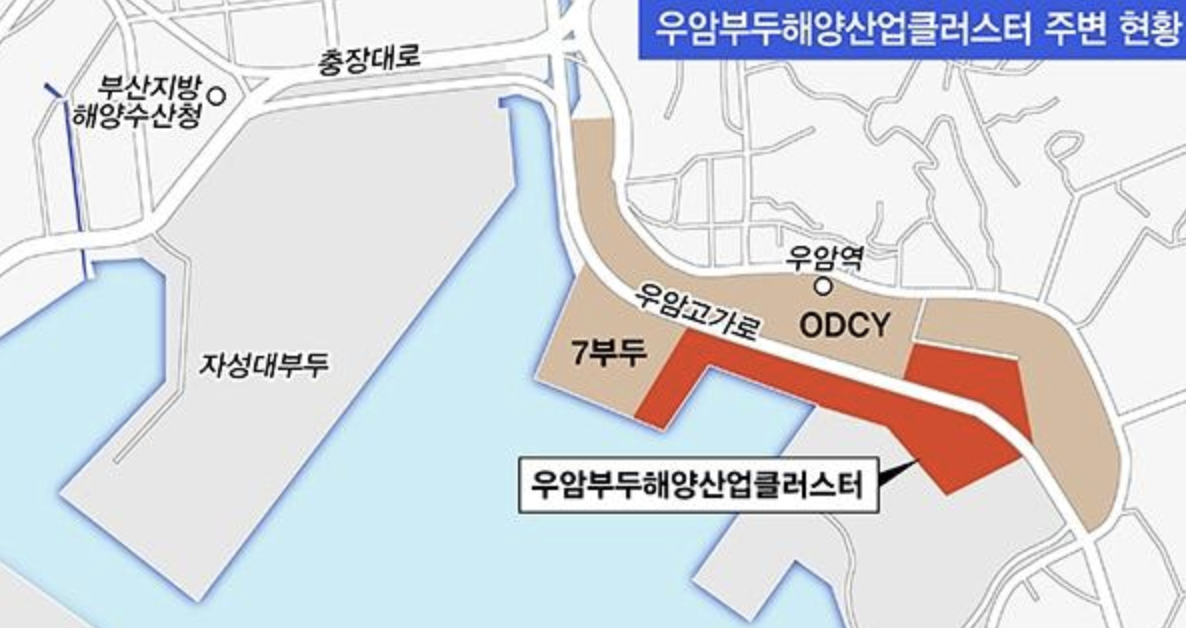부산을 해양관광 1번지로 키운다는 정부의 계획을 소개하면서 우암해양클러스터 위치에