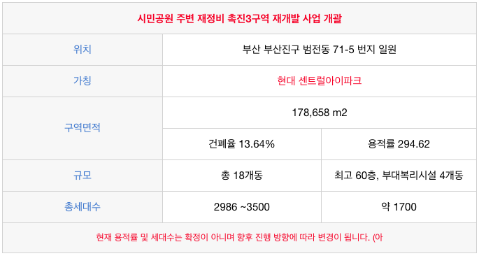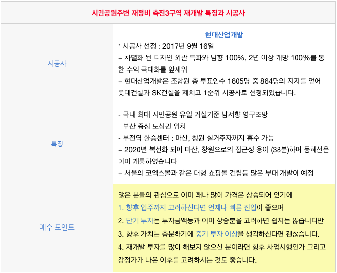 시민공원 촉진3구역 재개발의 간략한 특징 입니다.