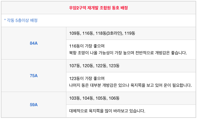 우암2구역 재개발의 조합원 동호 배정입니다.