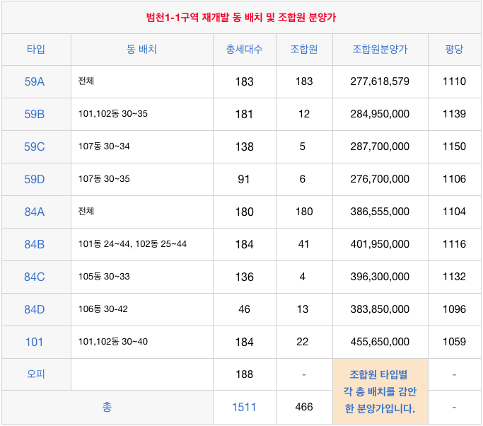 현재 각 타입별 세대수와 조합원 분양가 그리고 동호수 배정 부분 입니다.