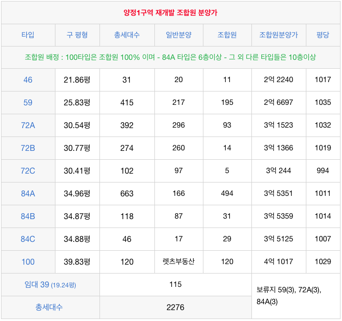 양정1구역 재개발의 각 타입별 세대수와 조합원 분양가 입니다.