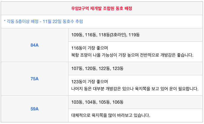 - 84A가 전반적으로 조망이 기대가 되며 다른 타입들은 소액으로의 장점을 가지고 있습니다.