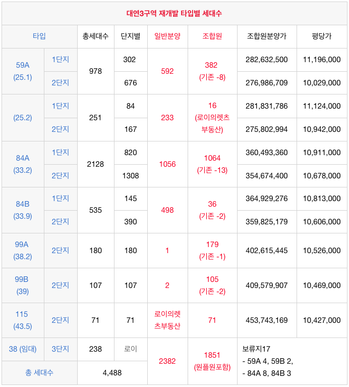 대연3구역 재개발 각 타입별 세대수와 조합원 분양가 입니다.