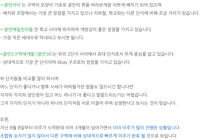그 하나의 단지로만 볼것이 아니라 인접해 있는 광안자이, 광안애일린의 뜰과 함께