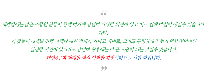 또한, 최근 조합추진위장님의 부고로 인해 새롭게 조합추진위가 구성이 될 예정입니다.