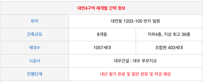 - 대연4구역: 대우푸르지오 철거마무리 : 1057세대 -> 입주시까지 3~4년