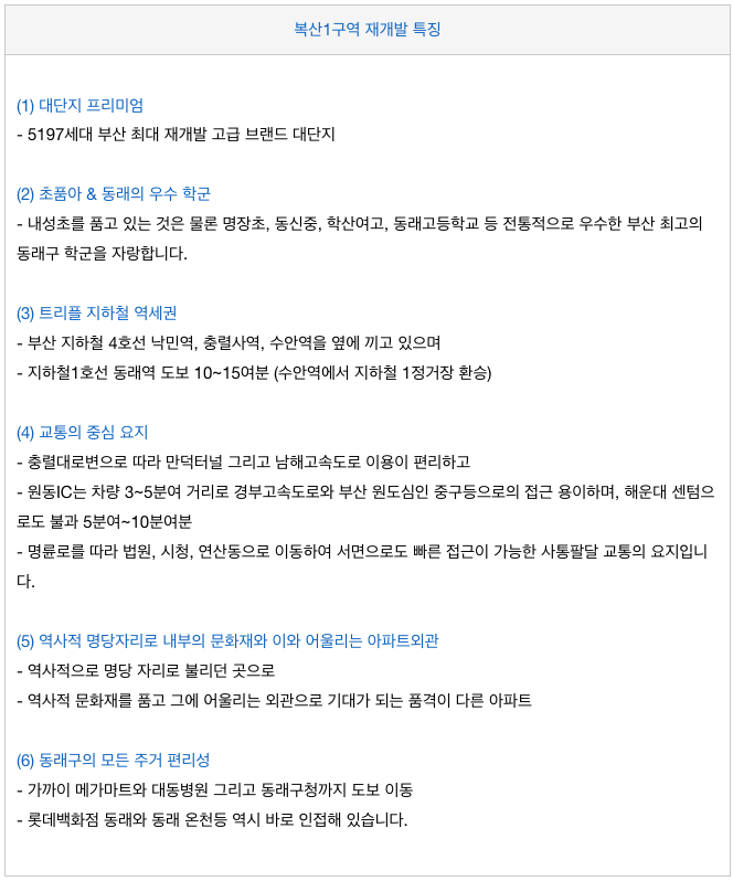 복산1구역 재개발의 특징을 간략히 살펴 보겠습니다.