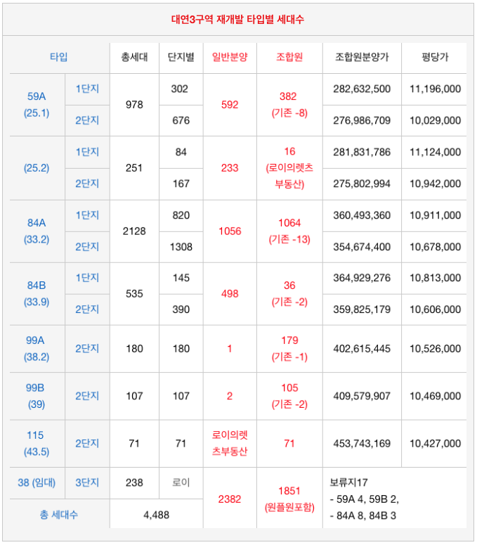 대연3구역 재개발 각 타입별 세대수와 조합원 분양가 입니다.