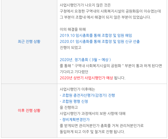 - 1년이 넘게 사업시행인가 신청이 들어갔음에도 아직 구청으로 부터 인가가 나오지 않은 진행상 부분