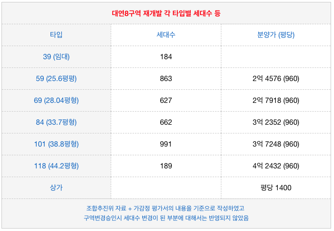 대연8구역 재개발의 아래 타입별 세대수와 조합원 분양가는
