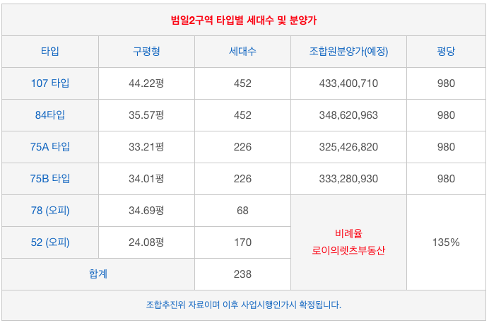 조합추진위에서 나온 타입별 세대수 입니다.