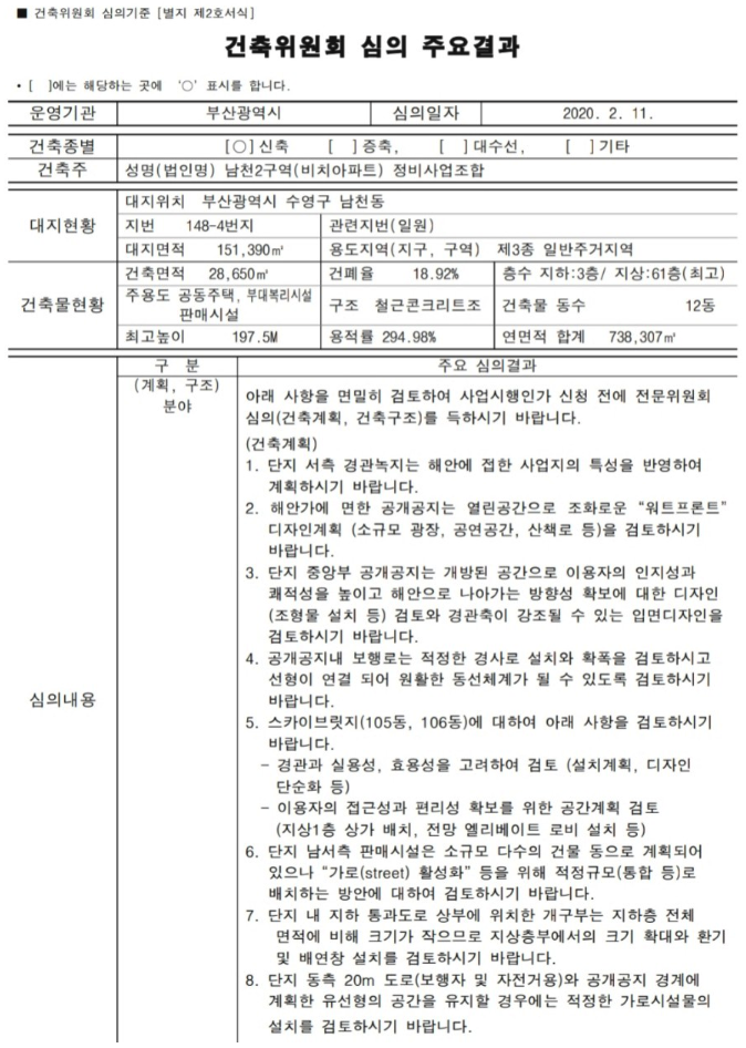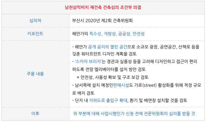 금번 남천삼인비치 재건축의 건축심의는 조건부 의결 부분 소개해 드리겠습니다.