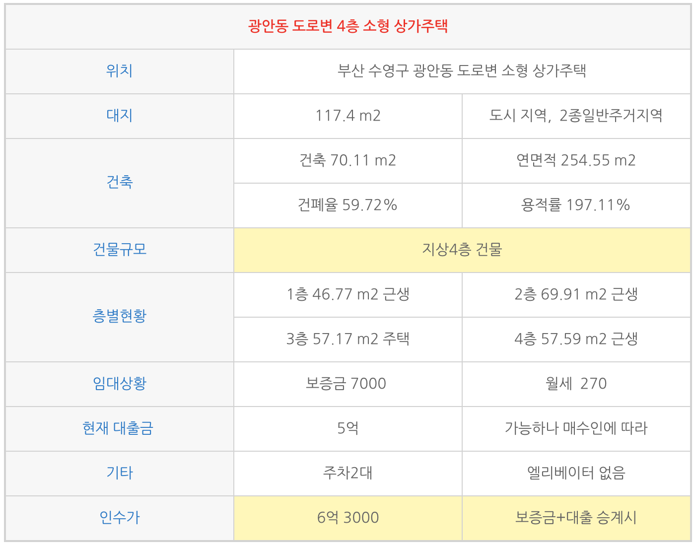 수영구 광안동 도로변의 4층 소형 상가주택 물건 상세 정보를 드립니다.