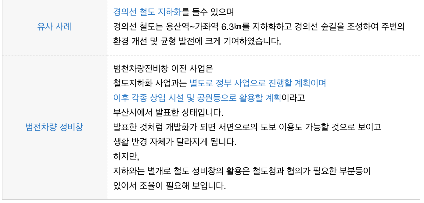 인근의 차량 정비창의 이전 및 개발 계획과 철도지하화의 호재를 가지고 있습니다.