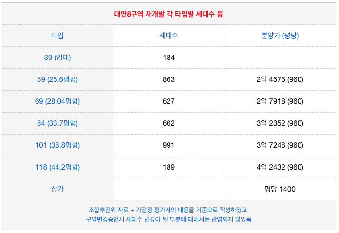 대연8구역 재개발의 아래 타입별 세대수와 조합원 분양가는