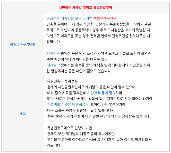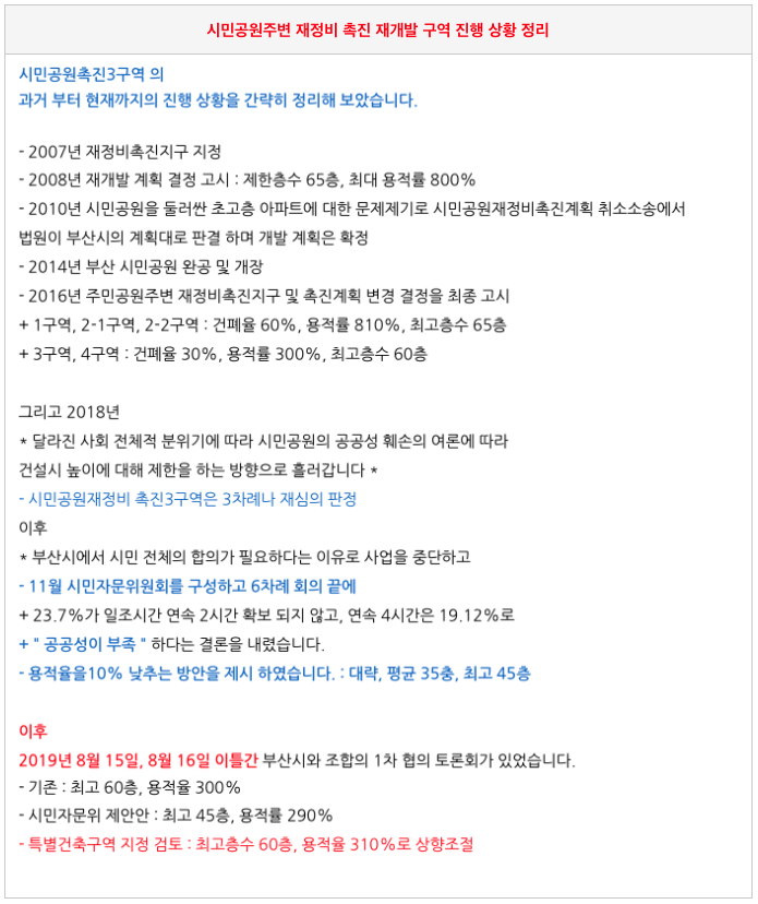 특별건축구역 내용과 시민공원 재개발 구역들의 현재까지 진행 내용들에 대해 간략히 정리해 드리오니 참조하십시오