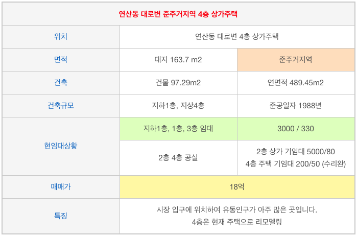 부산 연산동 준주거지역 대로변의 4층 상가주택 물건을 소개해 드립니다.