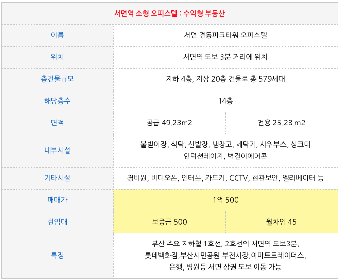 작은 수익형 부동산인 서면역에서 도보 3분의 소형 오피스텔 매매 물건을 소개해 드립니다.
