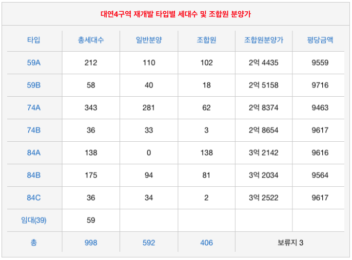59, 74, 84타입으로 구성되어 있으며 조합원 406세대, 일반분양 592세대, 임대 59세대로