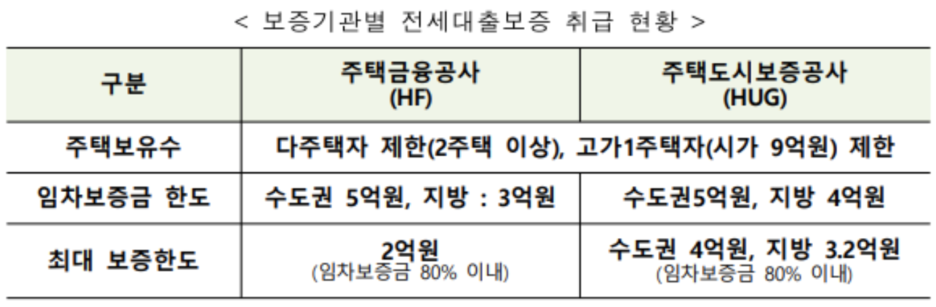 - 주택도시보증공사(HUG)의 1주택자 대상 전세대출보증 한도를 2억원으로 인하