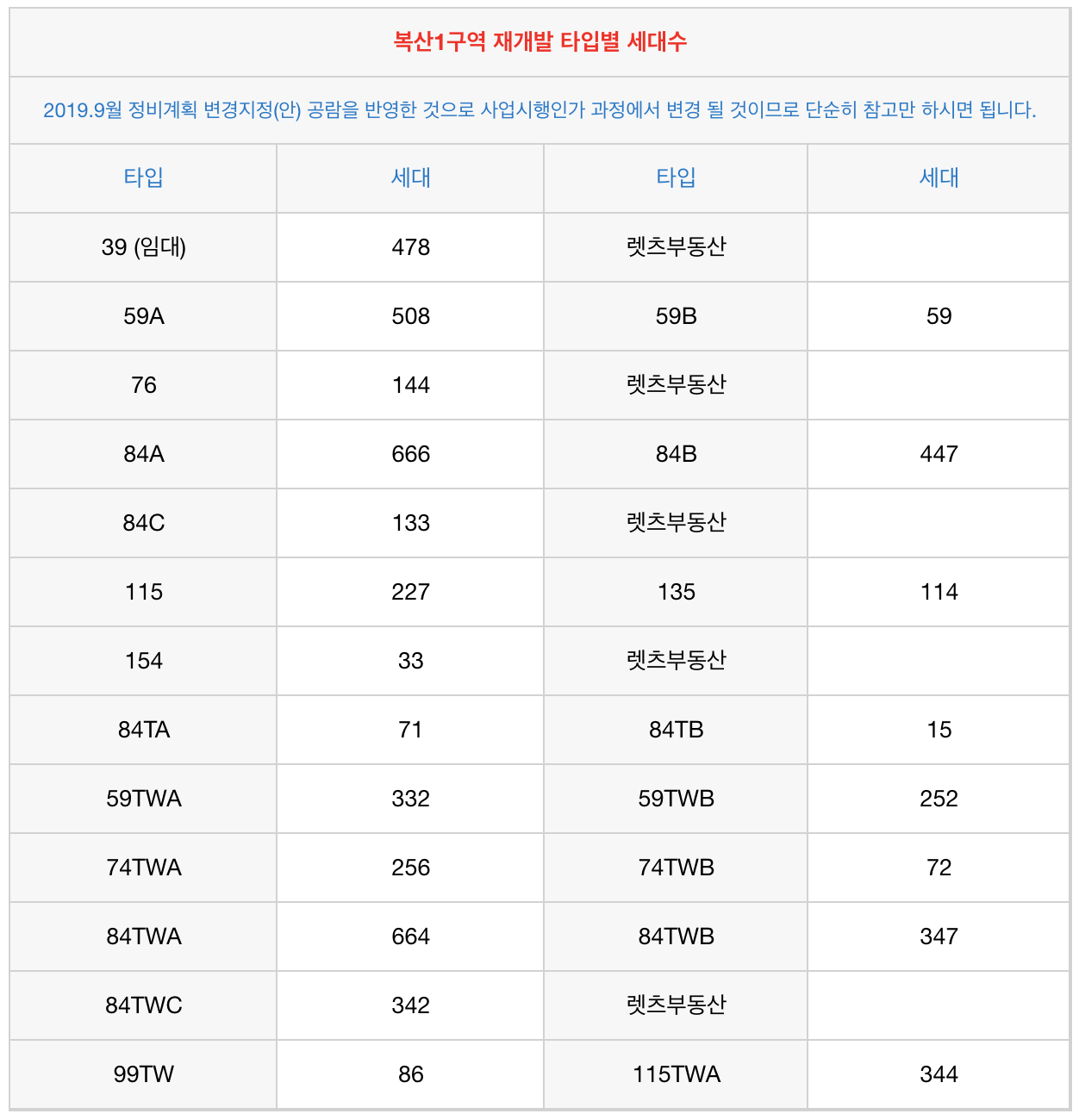 복산1구역 재개발의 타입별 세대수는 아직 미확정입니다.