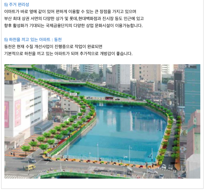 부산의 중심 도심 서면권으로 옆으로 동천강이 있어서 개방감이 좋으며