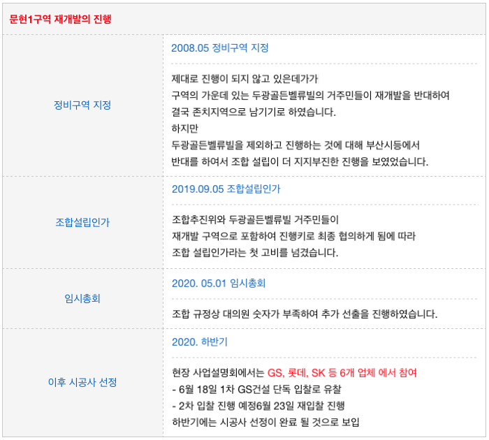 조합설립이 작년에 된 아직 재개발의 초기 단계라고 할수 있고 이제 2020년 하반기에 시공사 선정이 예정되어 있습니다.